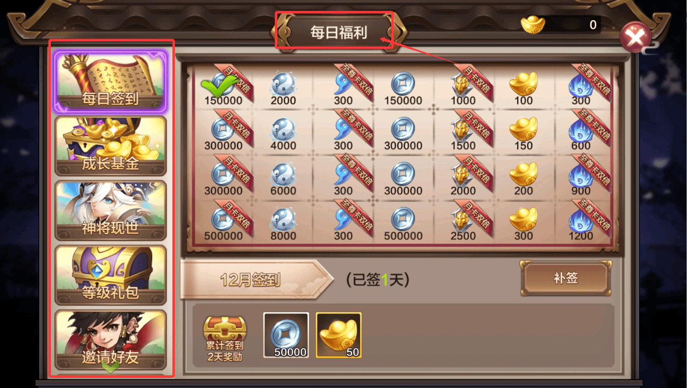 2、在“每日福利”界面中,签到系统提供随时间累积的丰厚奖励,包含大量铜钱与元宝。此外,成长基金、等级礼包及邀请好友等功能,也为角色成长提供了持续的资源支持。