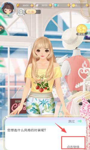 1、看到界面弹出 “您想选什么风格的时装呢?” 的提示后,点击弹窗里的 “点击继续” 按钮,就能推进流程。