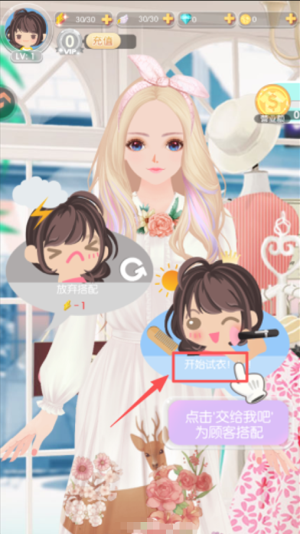 2、当界面出现 “点击‘交给我吧’为顾客搭配” 的提示后,点击 “开始试衣!” 按钮,即可进入搭配环节。