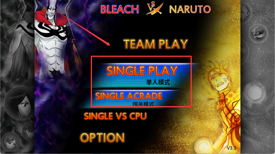 1、启动游戏,主界面背景是酷炫的动漫风格,两侧分别是《BLEACH》和《NARUTO》的代表角色。中间是四个核心功能按钮,最显眼的是“TEAM PLAY”小队模式。