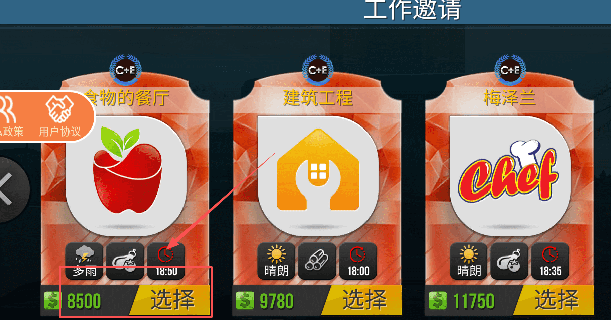 4、恶劣天气可能会影响驾驶难度和耗时。综合考虑报酬、天气和驾照要求后,点击最后的“选择”按钮就能愉快地出车了。