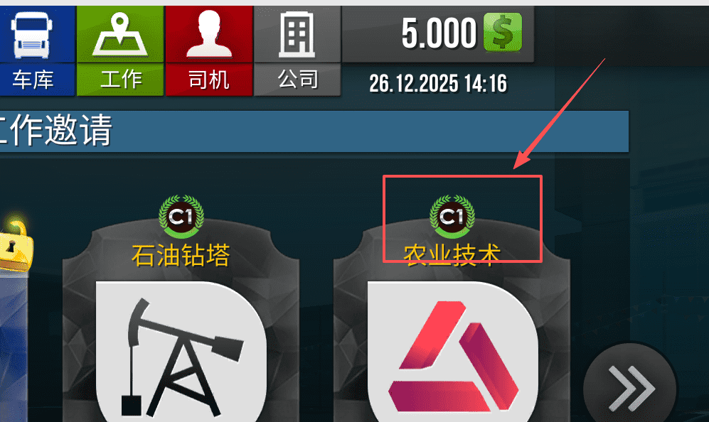 2、进入游戏主界面后,你会看到底部有“车库”、“工作”、“司机”、“公司”等选项。要接新任务赚钱。