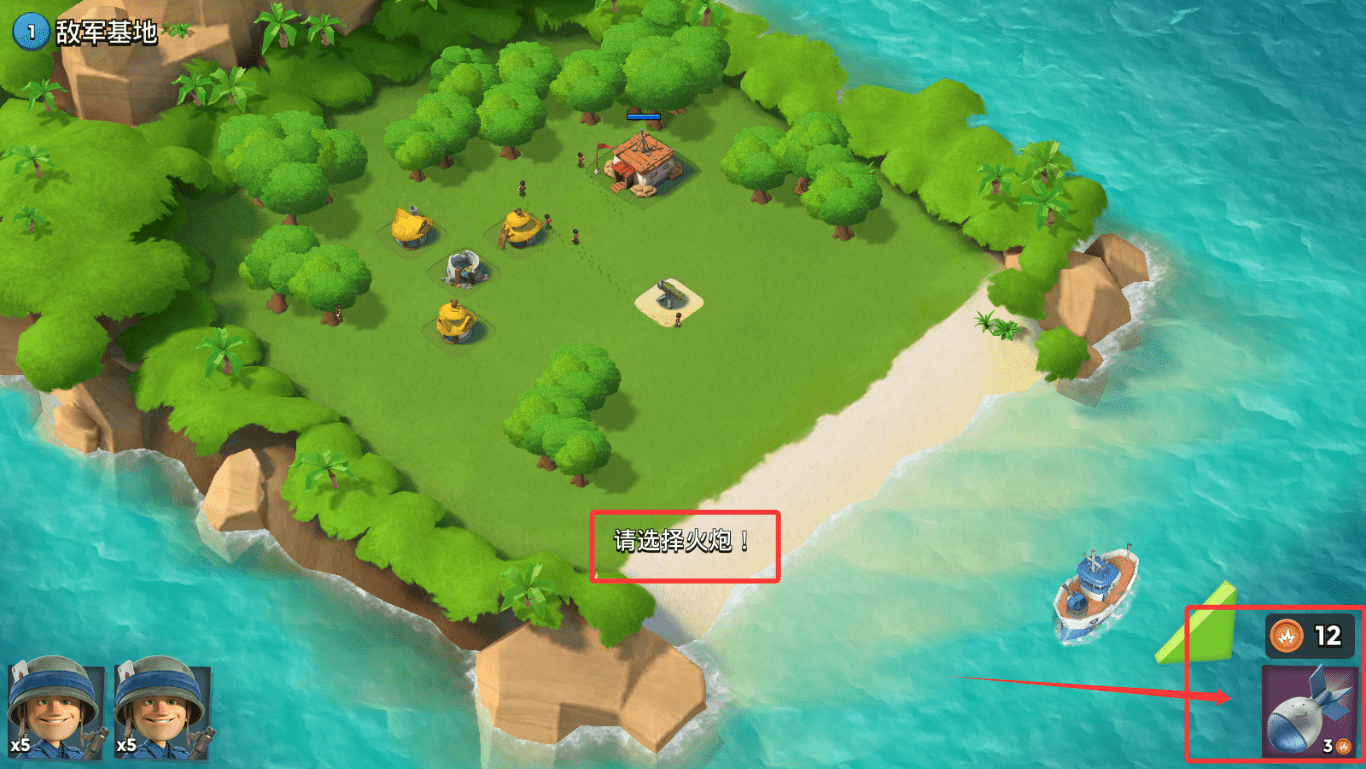 技巧4:登录被占领岛屿之后,先使用军舰上的炮弹打被占领岛屿上的高射炮或是那座岛上的防御设施。军舰上的炮弹使用方法,点击屏幕右下角的炮弹图标,而后选中你要打的防御设施。