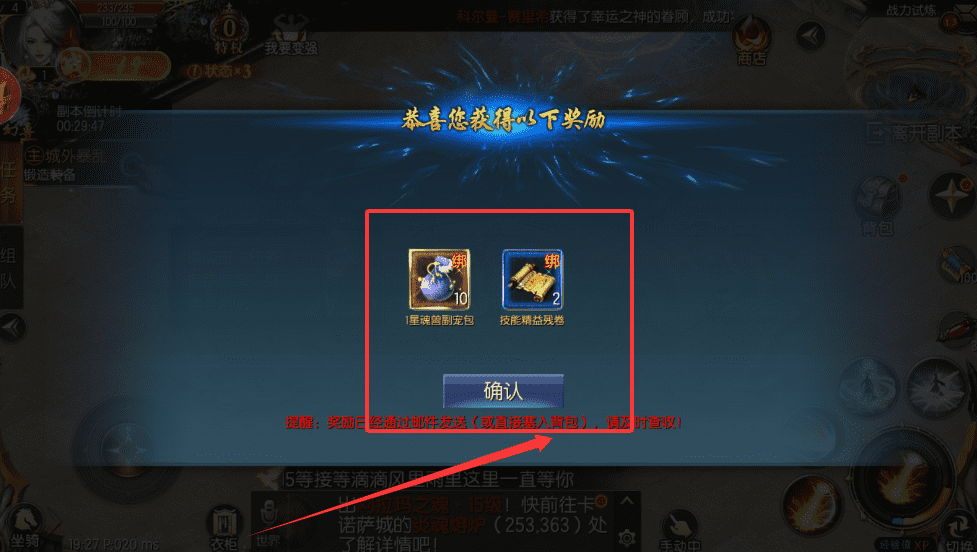4、最后点击确认按钮,奖励就会发送到背包里啦。