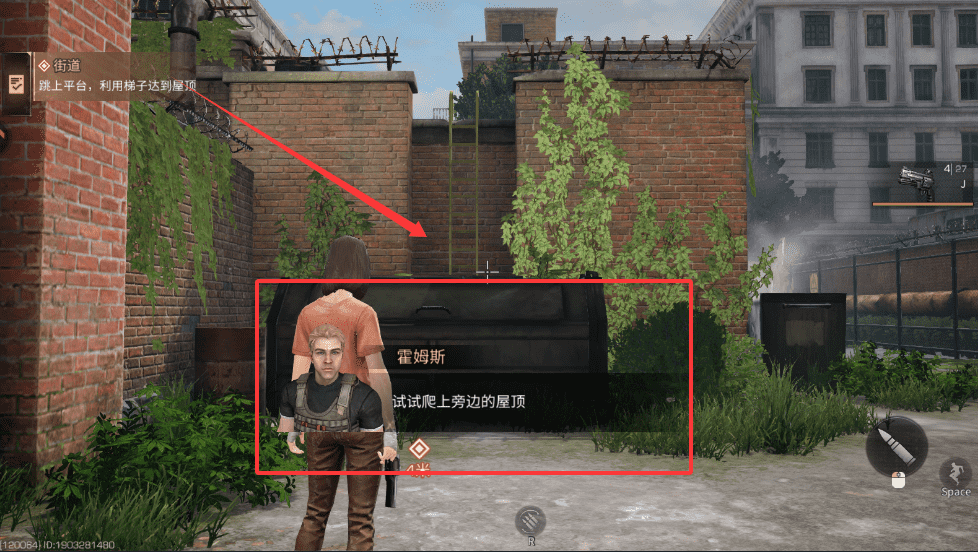 4、找到穿橙色上衣的角色霍姆斯,根据提示跳上平台并利用梯子爬上屋顶吧。