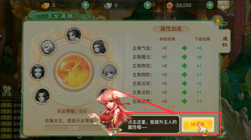 1、提升属性需点击主界面“天女属性”面板,找到“修炼”按钮并点击消耗资源即可哦。