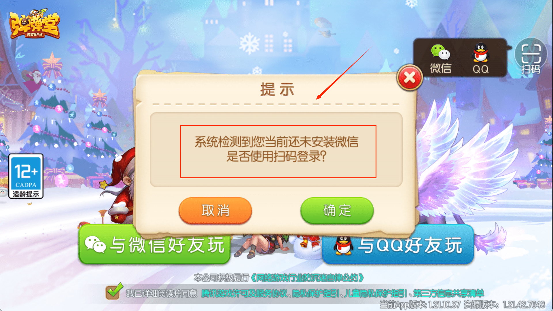 3、登录主界面充满了圣诞元素,很漂亮。在登录前,先看一眼左上角的游戏名称和适龄提示。然后,在界面中下部,你会看到两个大大的彩色按钮,选择一个你喜欢的登录方式点击它。