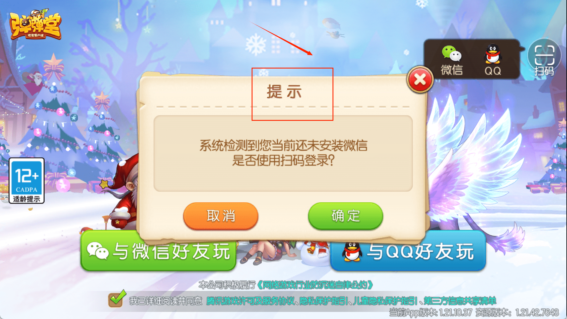 3、现在进入主登录场景了,背景是童话般的雪地。请注意界面左侧的适龄提示,确保你适合这款游戏。之后,在屏幕下方选择是通过微信还是QQ来登录你的游戏账号。