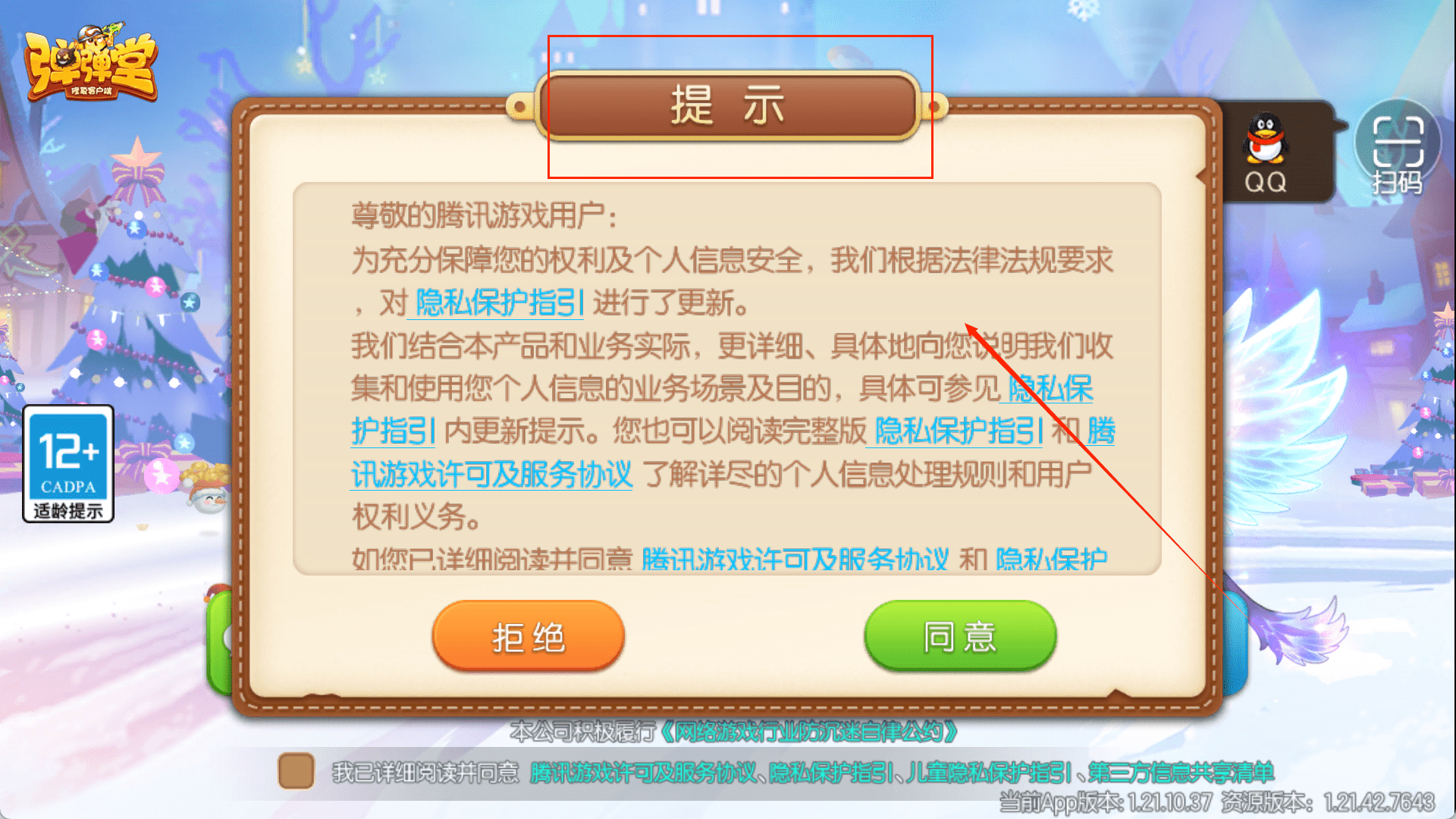 1、打开游戏后,第一个迎接你的是更新提示弹窗,背景是冬日雪景。你需要在这个界面稍作停留,读一下关于用户权利和隐私保护的说明,然后点击“同意”按钮进入下一步。