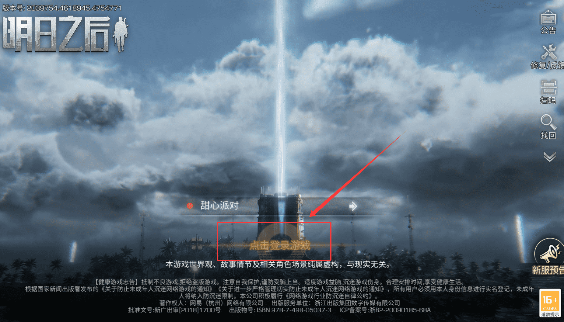 1、首先呢,在登录界面点击“点击登录游戏”进入,记得要仔细阅读那些健康提示和版权信息哦。