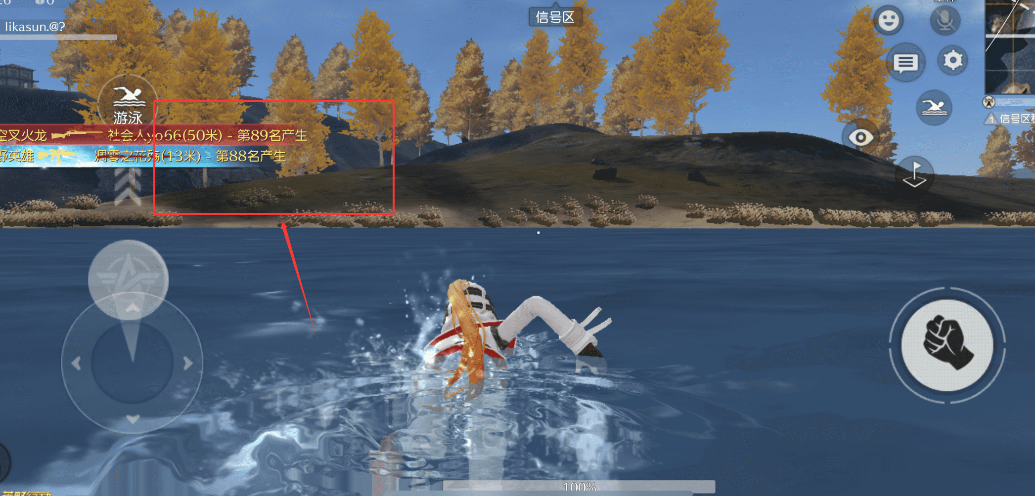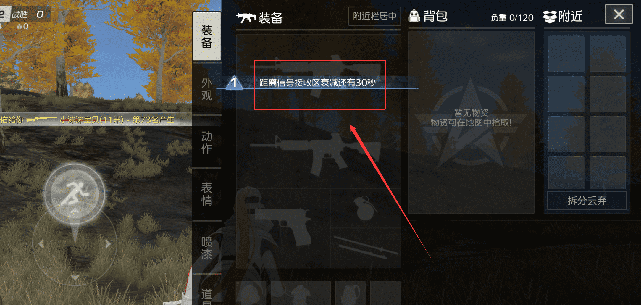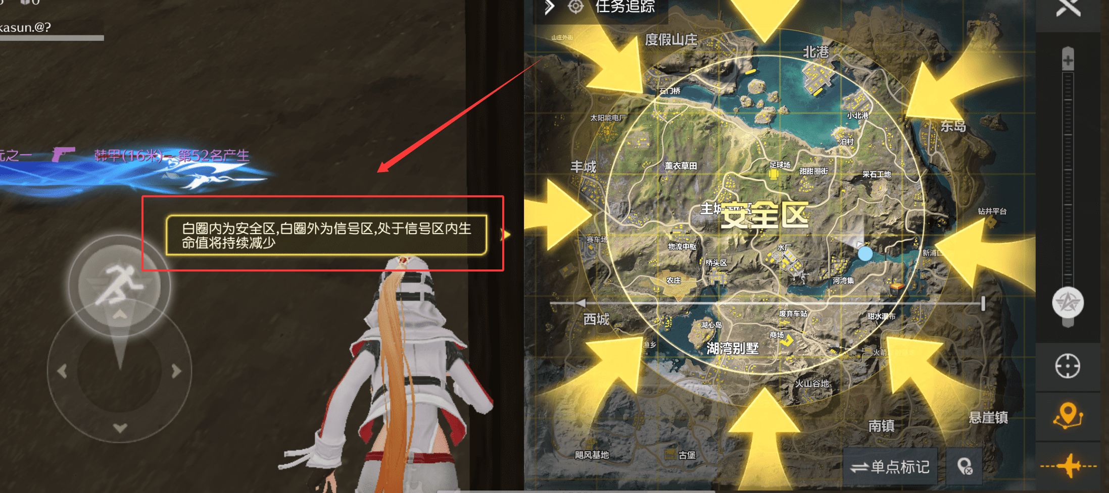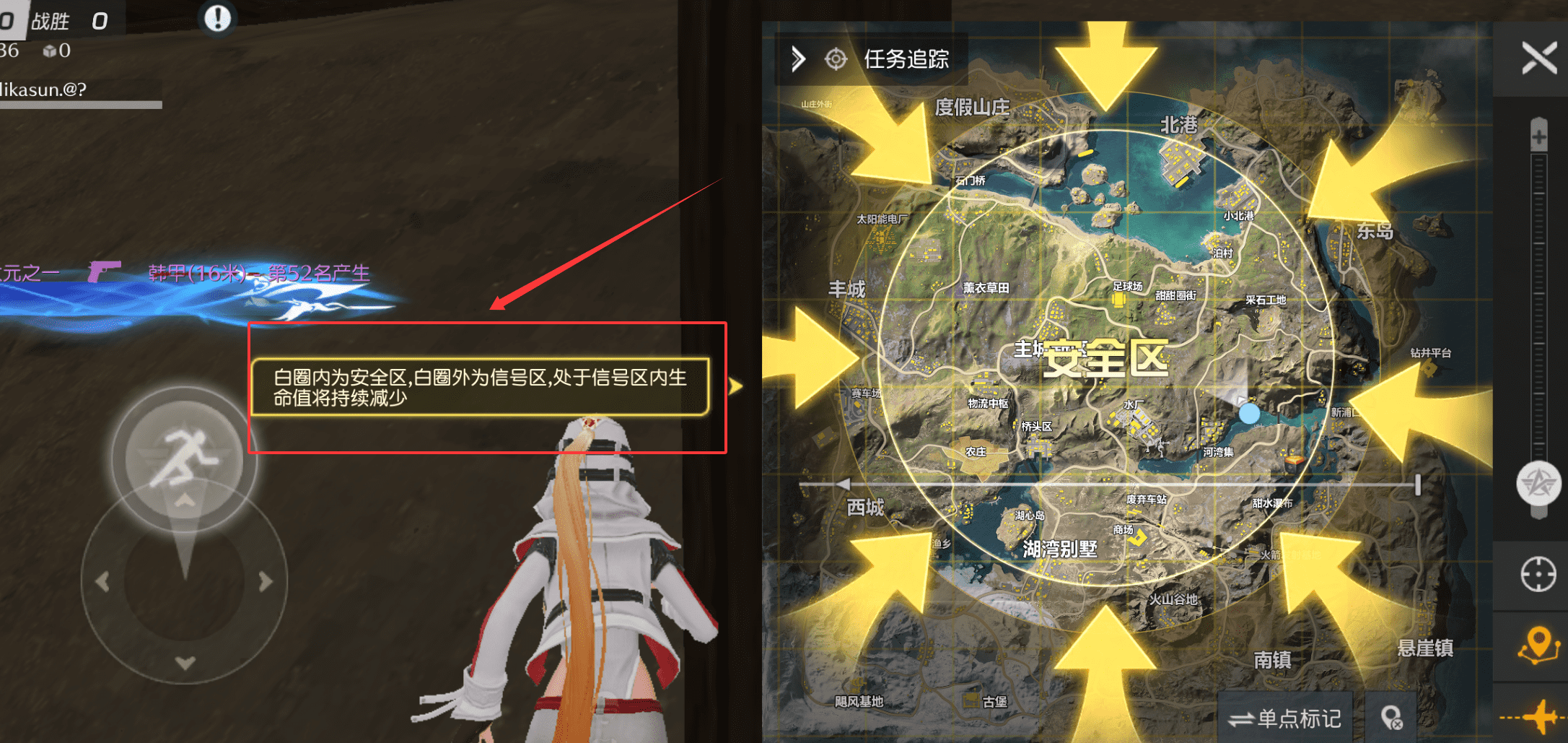 1、首先注意屏幕顶部的安全区提示呢,白圈内是安全区,白圈外信号区会持续扣血,要时刻留意自己的位置。