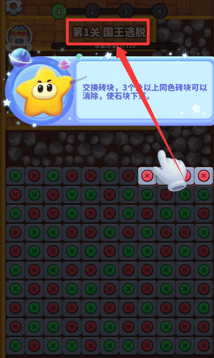 4、遇到像“第1关国王逃脱”这样的任务时,注意界面提示的“收集进度”和“使石块下落”等目标。
