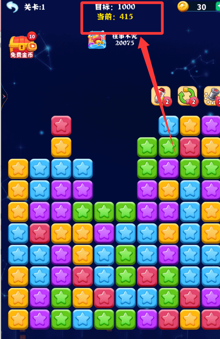 游戏的核心玩法是通过消灭星星来获得积分的关卡模式。简单来说就是“消除”,没有时间限制,但是每一关有目标分数, 你同时消去的星星越多,就能得到越高分,最后剩下的星星越少,得到的奖励越多.消除方法是,点击颜色相同成块的方块或者星星,它就能被消除。同时消除的方块越多分值越高。你也可以尽量让所有的方块被消除,会有更多得分。