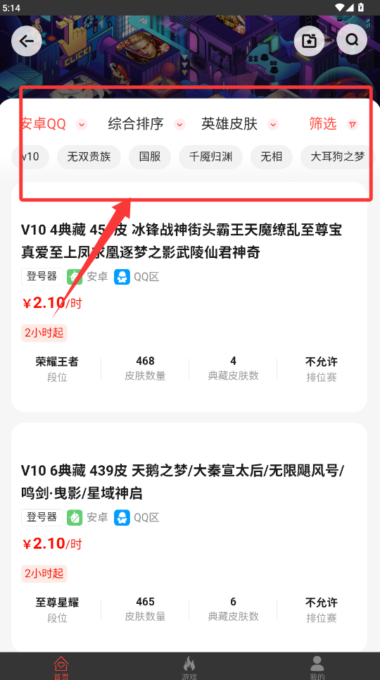 3、若选择租用账号体验游戏,可点击“特惠租号”专区,根据筛选条件如“安卓QQ区”、“英雄皮肤”或“段位”来挑选合适账号,列表会清晰显示每小时租金与起租时长。