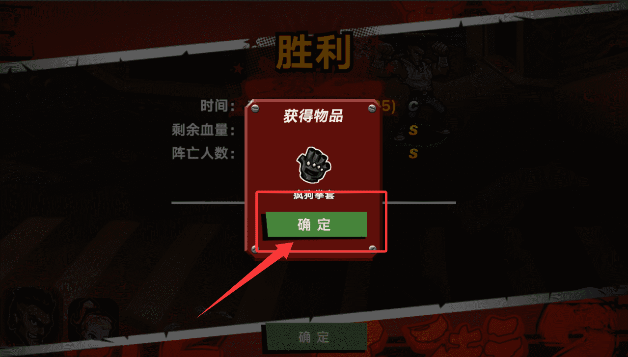 2、战斗胜利后将显示结算界面,其中包含通关时间、剩余血量、阵亡人数等数据,并可领取“疯狗李套”等获胜物品奖励,这些装备与材料是后续强化的基础资源。