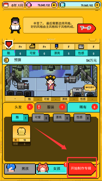 选择参与的人员,定义专辑的标题、主题、风格,挑选专属的声乐总监来帮助你更好的完成专辑制作,期间头发、服装的稀有程度也影响你的收益。