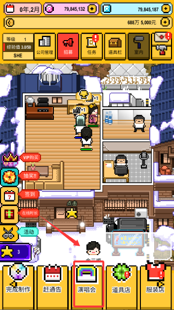 选择演唱会场,选择参与的成员,制定相应的门票价格和奖金比例来获得收益和粉丝。