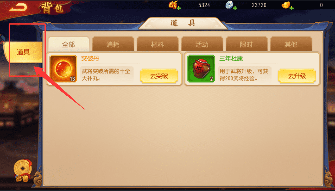 4、在游戏进程中获得突破丹与三年杜康后,首先需要打开背包界面,在“材料”或“消耗”分类下找到这些物品,并仔细阅读其具体用途说明,了解各自在养成体系中的定位。