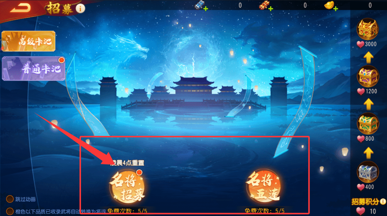 3、养成资源主要来源于招募与背包,前往招募界面利用免费次数抽取卡池,重复的武将将自动转化为资源。