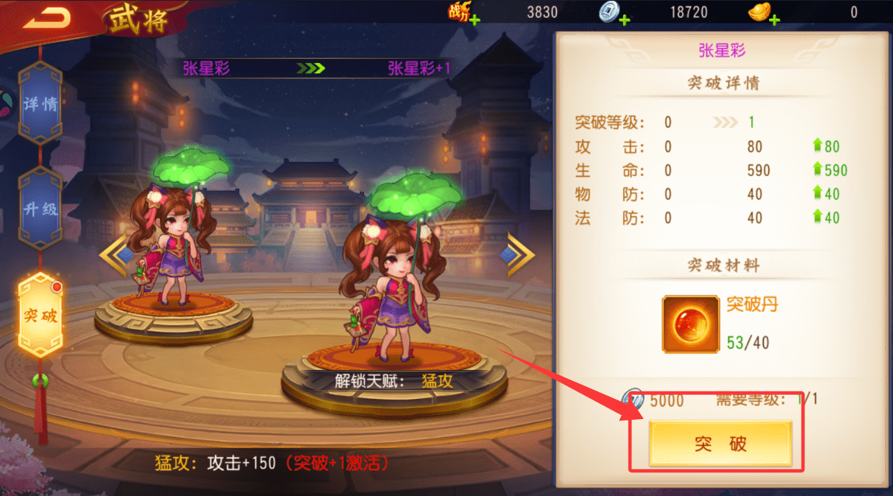 2、进入武将界面选中张星彩,可在详情页查看其突破前后的属性对比,当突破丹数量足够时,点击突破按钮即可提升其突破等级,激活“猛攻”天赋以增加攻击力。